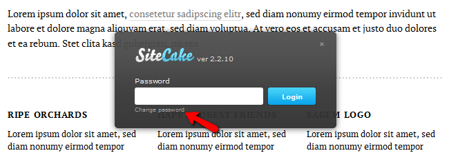 The first and more conventional option is for the situations when you know your password and just want to change it by using the automatic password change in Sitecake. To do that navigate to the entry portal as usual and click on the small text that reads Change Password and is located right under the password field.