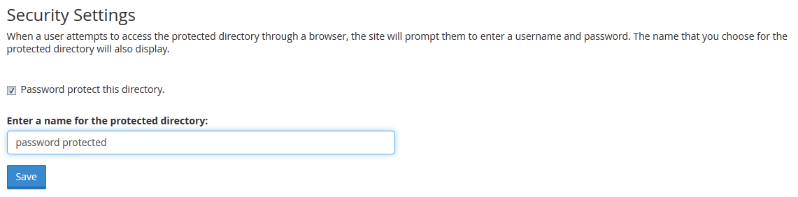 To activate the password protection on the directory click on the check box "Password protect this directory" and input a short message that will be displayed just above the login box when someone access this folder.