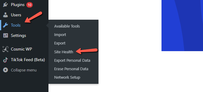 When using WordPress, you can access the Site Health page from your WordPress Dashboard and see lots of useful information that you can address to keep your site secure. You can reach it by going to Tools and then clicking on Site Health.