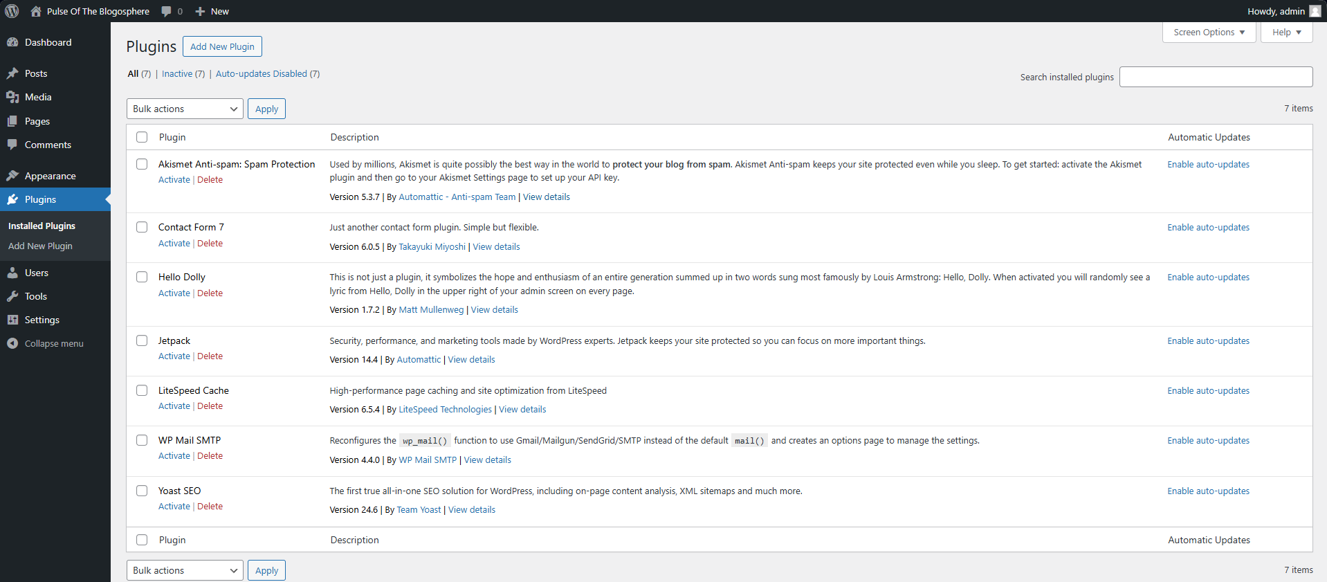 As you can see in the screenshot above, we downloaded a bunch of plugins to show how they appear in the Plugins interface. You can manage your plugins from this table with ease. Inactive ones can be activated or deleted, and active ones can adjust their settings. If it has one, each plugin will have a link to its settings menu once activated. Some plugins will add a section to the bar on the left, giving you direct access to their control panel without having to go through this table.