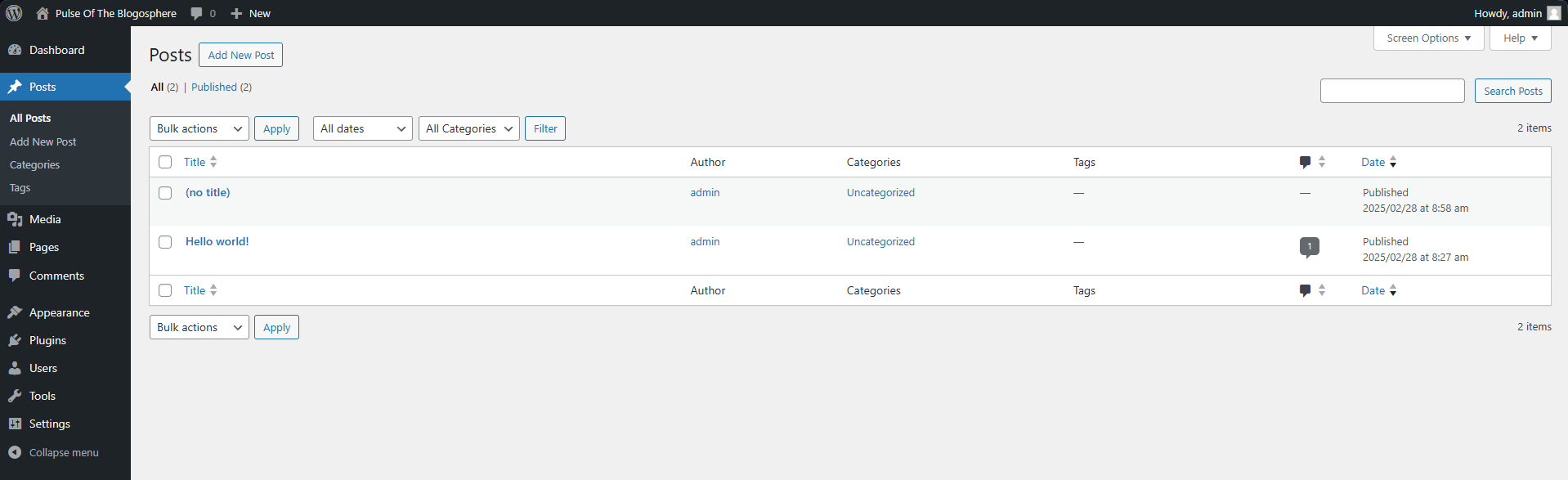 The Posts interface is an excellent tool since it will not only show you a table of all your posts, but you can also filter them by status, search for specific keywords, or perform bulk actions. These bulk actions allow you to delete several posts at a time. Additionally, you can change several of their attributes, including category, tags, author, etc., all at once. To edit multiple posts fully, you must do it one by one.