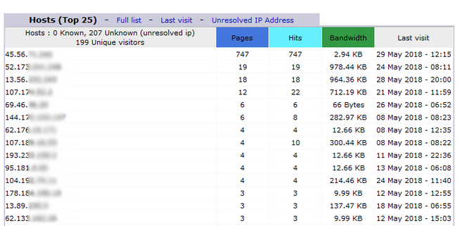 As an example, if we now check the Hosts section in Awstats for a domain for the month of May, we will see a list of visitor IP addresses like the one below.