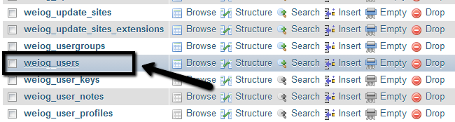 Once you access the database on your website via the phpMyAdmin service, you can proceed further with the password reset. To do so, you have to locate the prefix_users table. The prefix part will differ amongst the different websites that you are asked to set during the installation of your Joomla website. In our example, this is set to weiog, which means that the name of our table is weiog_users.