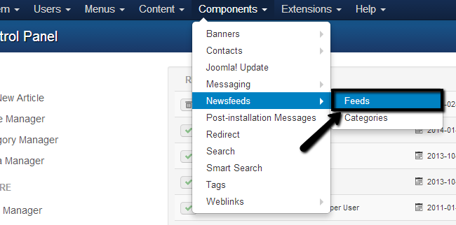 This step is optional and it is intended for those who have not created any newsfeed categories yet. To do that, log into your website as administrator, go to the Components tab and then Newsfeeds > Categories.
