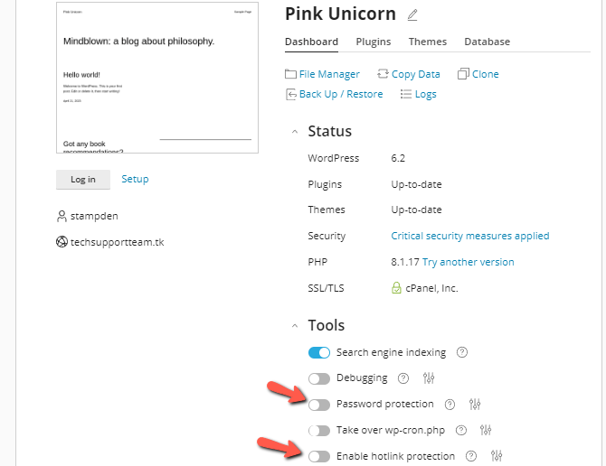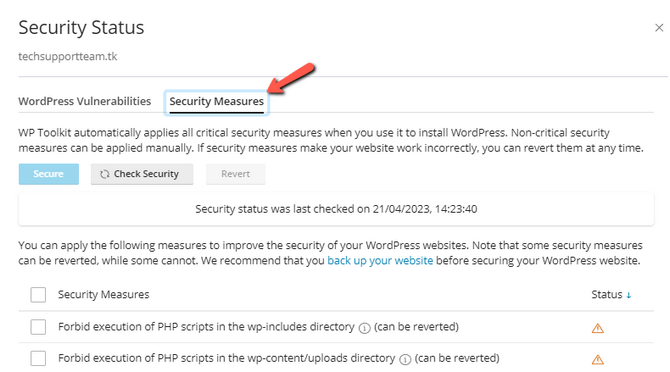 In either case, the vulnerability will be alleviated. If everything has gone to plan, there will be no further warnings or issues with the WordPress installation. The information page will look pristine, as it should. That is not all, though! The WP Toolkit comes with a slew of other security options, which can be found on the same page you just resolved the vulnerability. Click on the Security Measures tab, and you will see every bit of security you can turn on for your WordPress website.