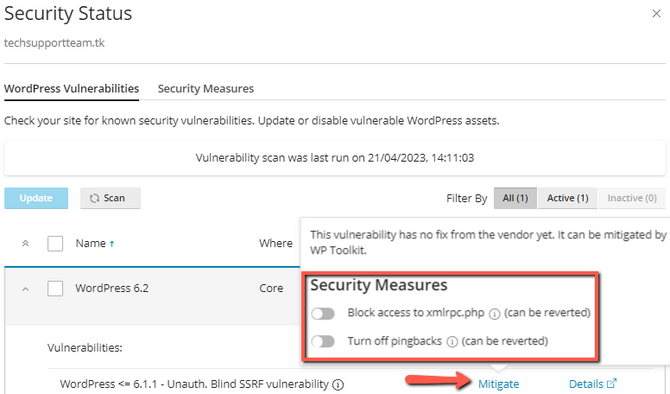 Clicking on the vulnerability will run a brief scan, after which you will see information about whether a security update for your WordPress version is available. If it is, you can update it from here. Also, you will see the exact issue the Toolkit is trying to show you. The Details button will take you to a different page where you can read more about the particular vulnerability. Clicking on Mitigate will show you options for resolving it. In this specific case, after clicking on Mitigate, the information we get is that there is currently no actual fix for this vulnerability. Still, the WP Toolkit has a way to mitigate it, as the button's name suggests. You can choose to turn on either both or only one of the proposed solutions.