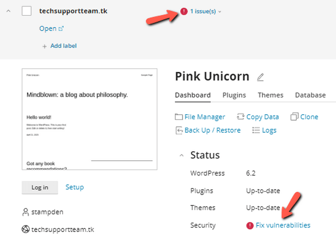 Sometimes a red exclamation point may appear in the WP Toolkit dashboard, demanding your attention. That means that the Toolkit has discovered a security issue with your website: a vulnerability as the Toolkit calls them. Do not worry, though, because the Toolkit is excellent in resolving or mitigating them. If you see the red exclamation point, then click on it. Below is an example with a brand new WordPress installation, what a vulnerability might look like, and how to resolve it.
