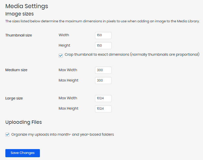 The Media settings will allow you to set limits on the size, in pixels, of images that can be uploaded to the media library. You can also choose to allow the system to organize your images into per-month and per-year directories.