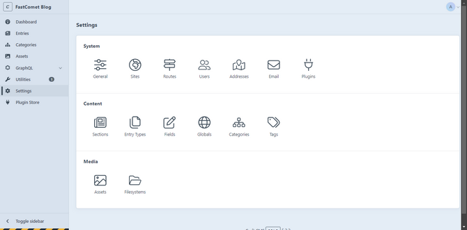 The penultimate section of the Craft CMS dashboard is Settings. There are menus here to configure your application’s system and design your content model. From here, you can control all aspects of your application, create all the necessary elements, and manage your media and uploads.