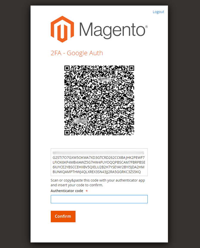 Open your preferred authenticator and scan the QR code or enter the alphanumerical code in it. You can check our tutorial on 2FA for your FastComet.com account from above for more details. Once you have added the Magento website to your authenticator you will see a six-digit timed code. Write that in the page you scanned the code from and click Confirm. With that you have set up Two-factor Authentication for your new Magento website and you can proceed to the dashboard.