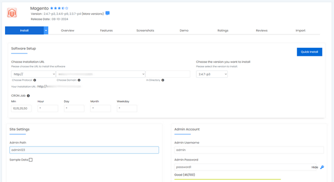 Since this is a tutorial about installing Magento, we will focus on the Install tab. You might have noticed there is an arrow next to it. That opens a small drop-down menu which offers you a choice between Quick Install and Custom Install. We will focus on the Custom Install since it is the exact same as the Quick Install but with more customization options. It is also what Softaculous defaults to when you click Install, instead of choosing from the drop-down.