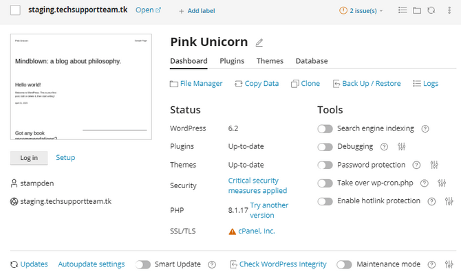 With this said, you have a staging website set up and ready to be worked on. You can make any changes you want because they will not affect the live website in any way: the staging site uses a different directory and database, which are not connected to the live ones. Feel free to break the staging website all you want!