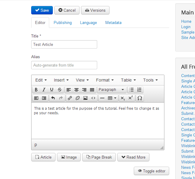 This tutorial reviews the process of submitting a new article on your Joomla website. To do so, you or your team members need at least an Editor access to your Joomla installation.