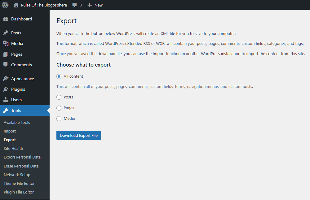 Firstly, administrators can export posts, pages, and media files directly from their websites to a file. That is done via the Export page in the Tools section.