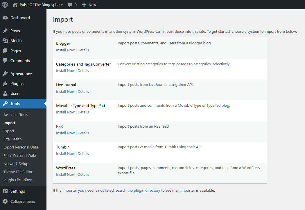 As you can see from the screenshot above, there are several “importers” you can use, depending on where you are importing from or what. As the disclaimer at the bottom says, you can check the plugin store for a different importer if the one you are looking for is not available.
