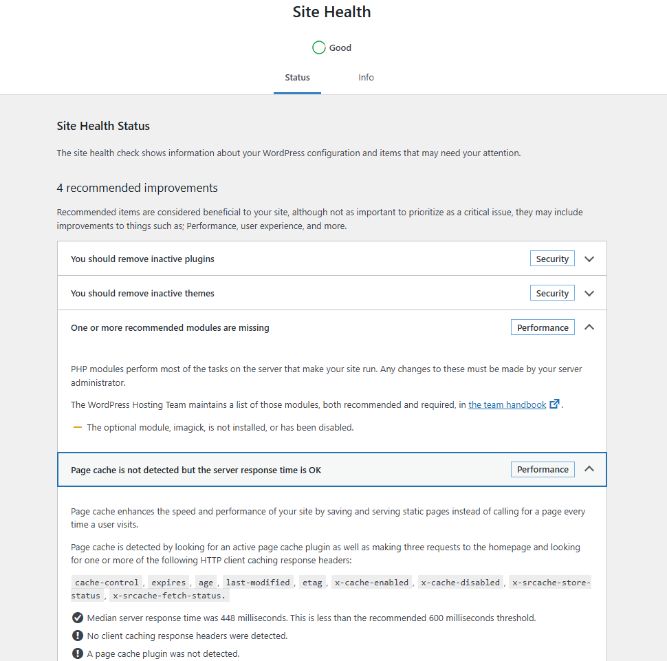 The Status tab shows critical information about the WordPress installation itself. Here, you will see various recommendations or essential issues that need resolving. For example, in the screenshot above, the system tells us that we should enable the imagick module for PHP and that we have no caching plugin. There are also suggestions for removing inactive plugins and themes for security reasons.