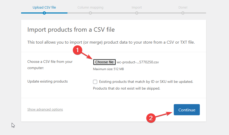 Both methods will take you to the WooCommerce CSV importer. Once there, click on Choose File. Locate it on your computer and then click Continue.