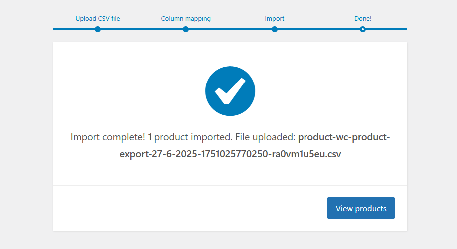 You will see a progress bar, and if there are no errors, a message will appear informing you that the import is complete. Click View Products to access your catalog and review the quality of the import.