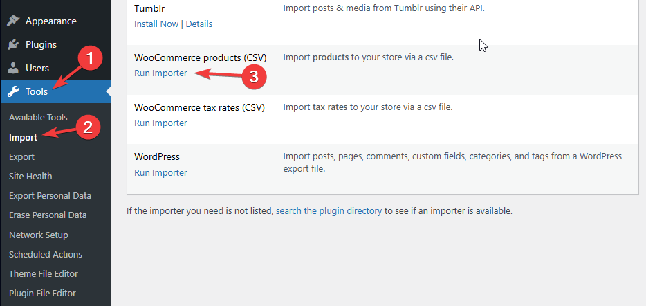 Once you have the file, log into the WordPress admin dashboard. You can access this by going to Tools > Import and selecting the WooCommerce Products (CSV) importer.