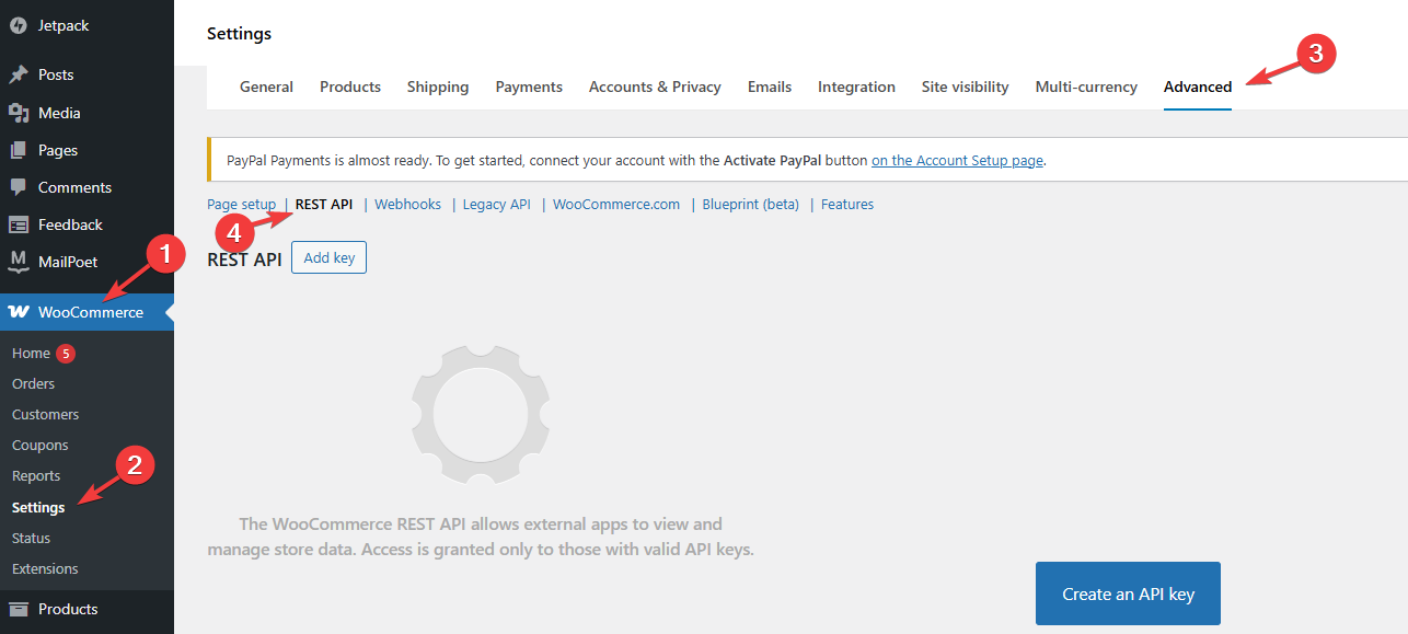 Now that you have set up the Naver API let’s do the same on the WooCommerce side of things. Log into WordPress and go to WooCommerce. There, click on Settings and the Advanced tab. Finally, go to REST API.