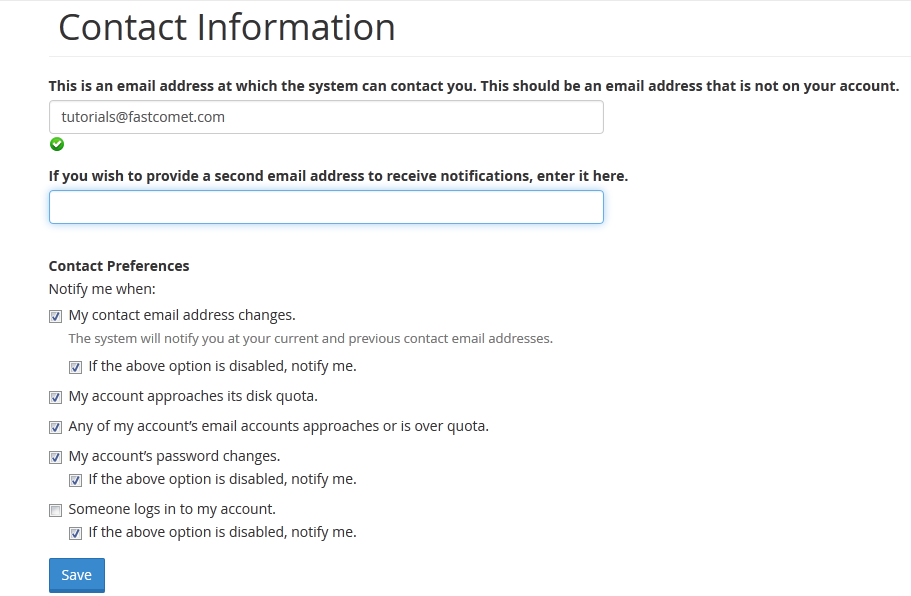cPanel supports notifications on certain events. If you would like to receive an email notification upon one of the following events you will need to configure your Contact Information: