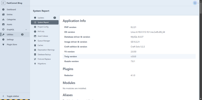 - System Report - Here, you can read about various things related to your application and the system it is installed on: PHP version, OS version, database driver and version, plugins, modules, etc.;