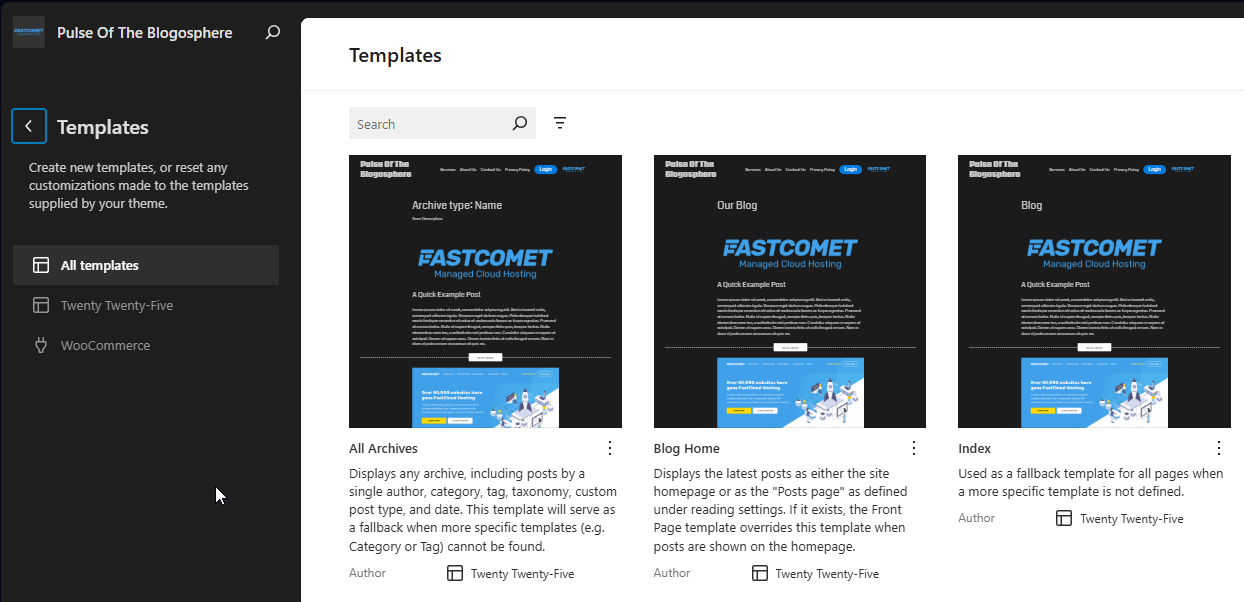 Head to Appearance > Editor > Templates and you will see all your theme has to offer. In our case, since we are using a default WordPress one, we have Templates for the homepage, missing content (404 Not Found), posts, etc.